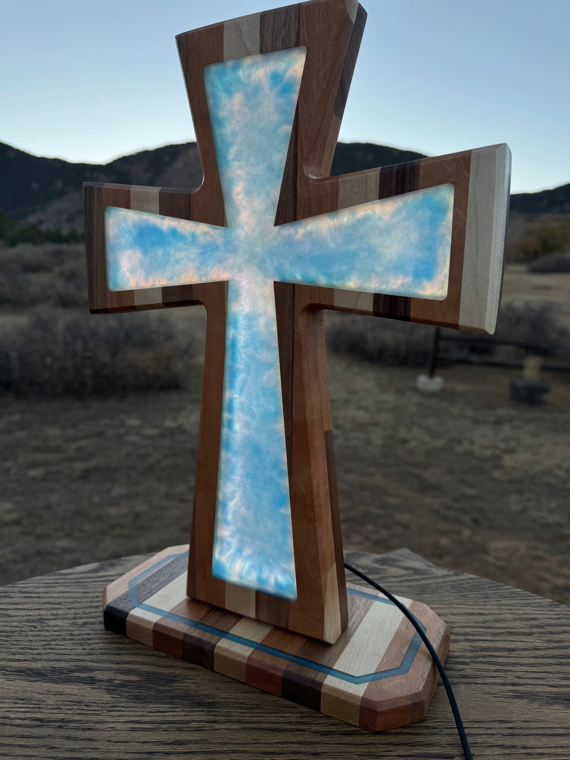 This Cross is sure to bring calm and spiritual peace to any room in your home. This gorgeous lamp is made out of walnut and features Pearl and Maui pigmented resin. USB C powered led lights bring this beautiful work of art to life. This lamp is 16' tall and 11.45" wide.